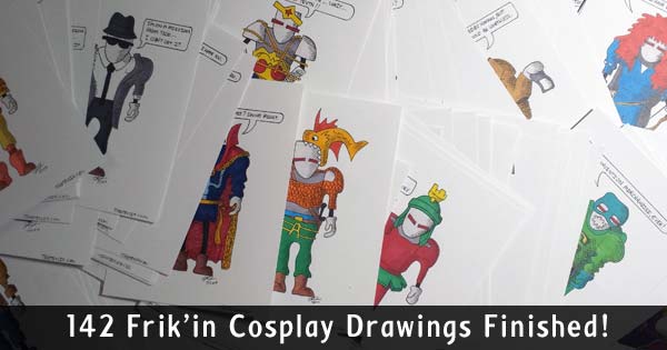 It took me 41 days to complete 142 Frik’in Cosplay drawings from start to finish, and I only had to put my hand on ice twice in that period of time. My goal was to get it done before end of October, and I managed to blow it out of the water because I set aside every other facet of my life in order to pull this off. Now I just need all of you to buy these from me at Geekinomicon and it’ll be all worthwhile! (or hell, buy them now, I don’t mind.)