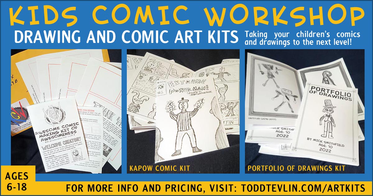 It’s taken several months, but finally it’s here! Take your child’s drawings and comics to the next level with Todd’s art kits that help them create 5.5″x8.5″ booklets from their work! These art kits come with everything you need, and in the end you get a stack of ten professionally printed booklets in your hand, perfect for gifts or keepsakes, or to even sell! (more booklets can also be bought for an extra fee.)