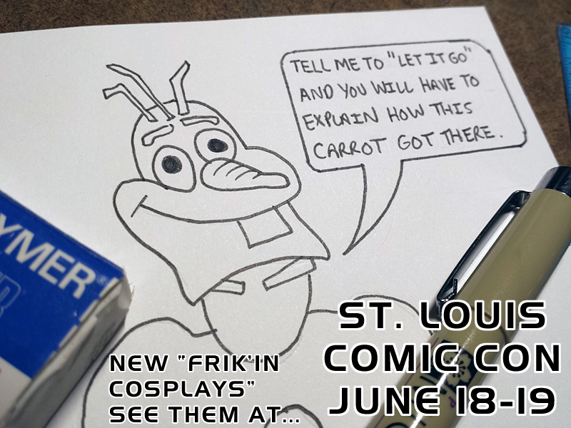 One of the things I sell at conventions (and online) is a thing I call “Frik’in Cosplay” drawings. I take my main character from my comic, FRIK, and pretend he’s a rag doll and throw a cosplay costume on him and then he responds to it. Frik’s a surly type, so usually what he says is always bitter and sarcastic.